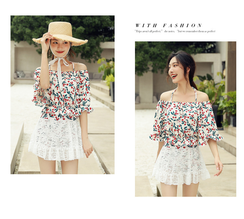 KKimee╭*特色一字領【露肩+蕾絲】【SJ22】顯瘦性感韓系A字裙荷葉滾邊鋼圈泳衣比基尼 BIKINI